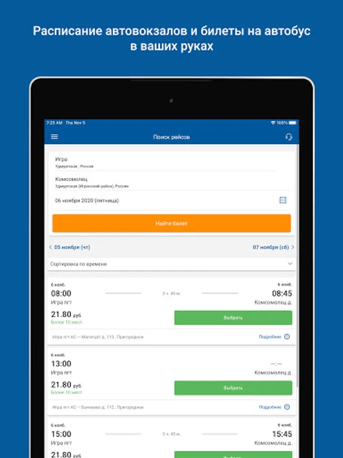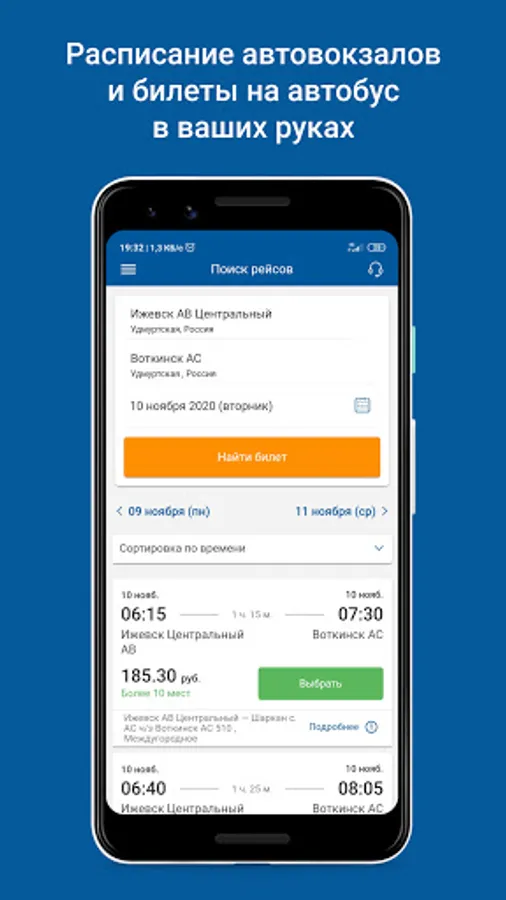 Bus schedule and tickets for Udmurtia bus stations, as well as some return flights.