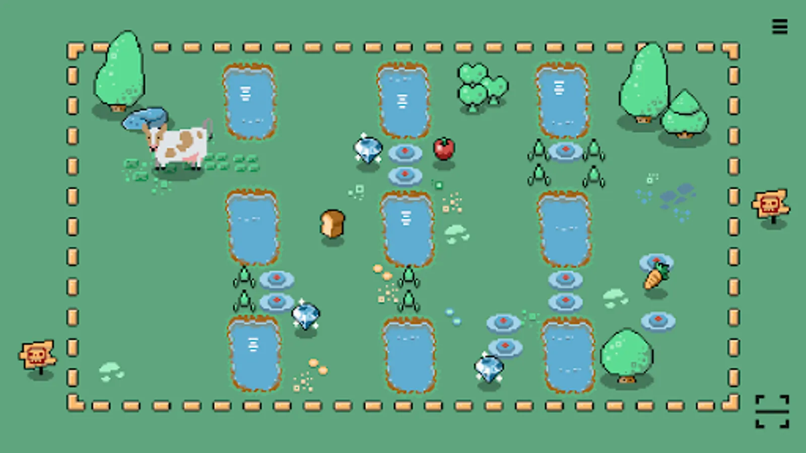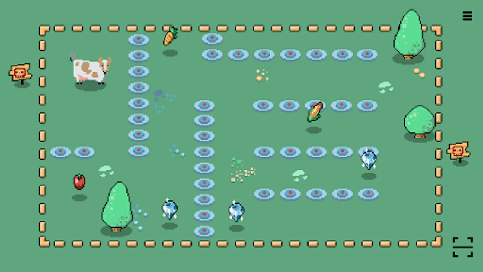 Feed the cow by juicy fruits, collect all diamonds, avoid the mines and help the cow make it to freedom!