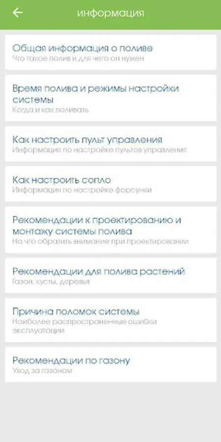 As it often happens, that this or that information is lacking on how to use the irrigation system, how to configure it correctly and how to choose a contractor that is proven and reliable. Especially for you, we have developed this application, which will be able to answer perhaps most of the questions at any time, such as: