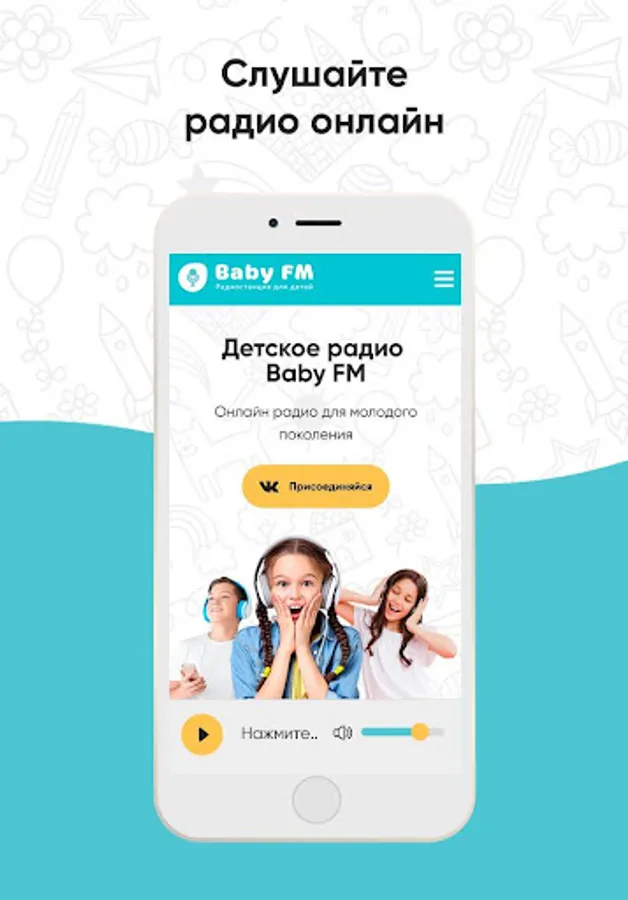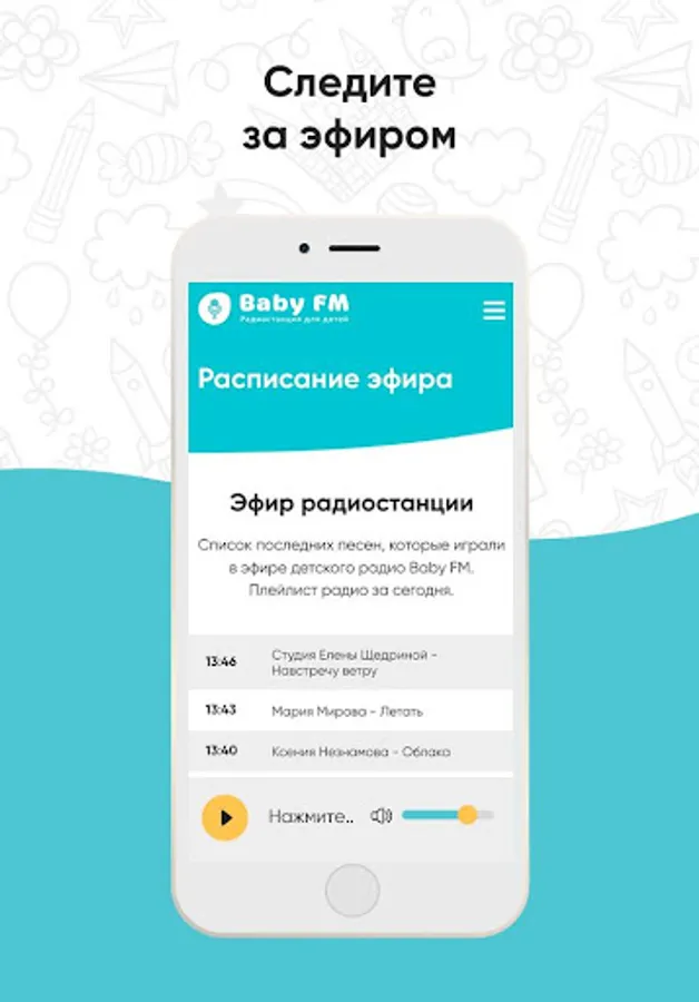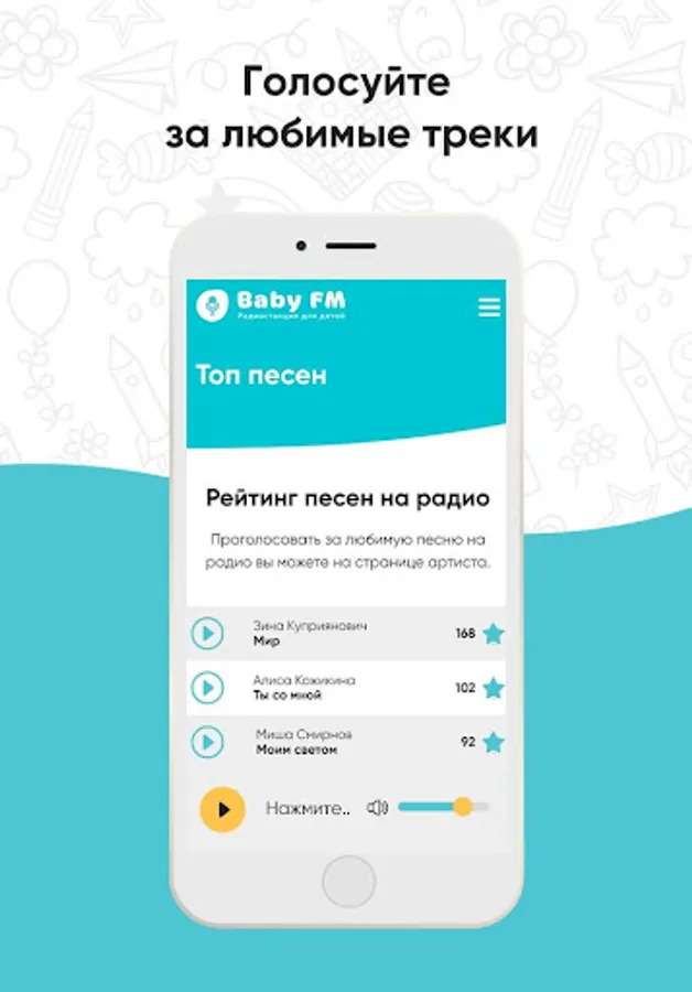 On the waves of baby radio Baby FM you can listen to free online modern children's songs. Every day our radio brings a lot of positive, positive emotions and provides a good mood. Just open the app and turn on the player. On the air, you can hear music performed by famous performers from Russia, Ukraine, Belarus, Kazakhstan, Armenia, as well as participants in the television music projects Voice of Children, Junior Eurovision and Best of All. In the process of creating the project, the tastes and preferences of the younger generation were taken into account. Everything was done to listen to children's radio was interesting. Here, nothing distracts children from listening and they can immerse themselves in an amazing collection of soulful songs and beautiful melodies. The application has the opportunity to vote for your favorite song in the rating of "Top children's songs." Thanks to the choice of users, the best children's songs are played on the radio more often.