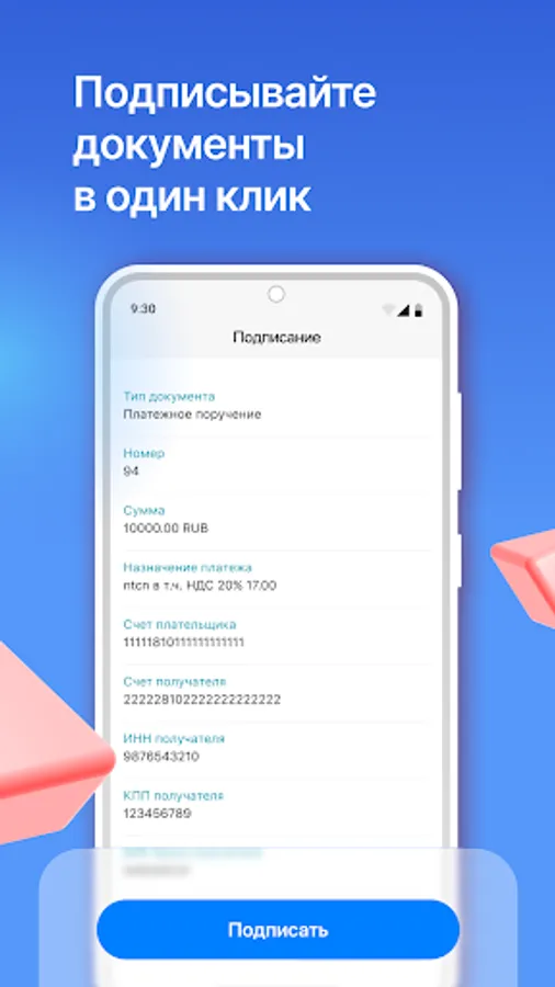 When confirming the transaction in the Internet Bank, you will receive a push notification about the need to confirm the transaction in the mobile application. After that, in the application, you can check the details of the document and sign it, or reject the signing.