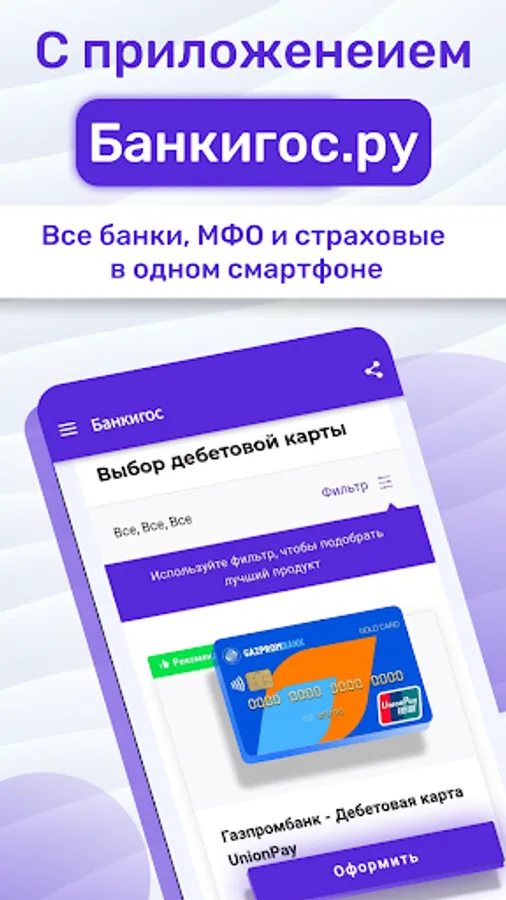 The Bankigos app contains offers from Tinkoff, Sovcombank, VTB, Renaissance Bank, Home Credit, UBRD and other banks. Using the filter, you can select the amount, term and rate, you can immediately specify options without insurance, without certificates, without collateral.
