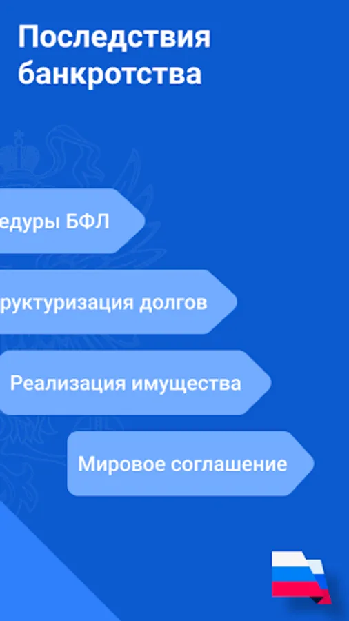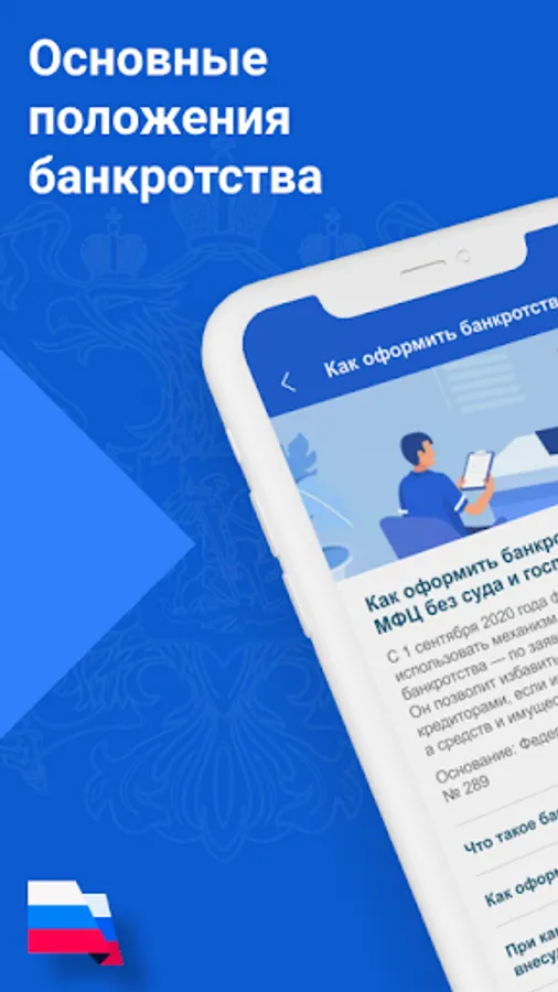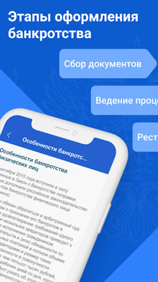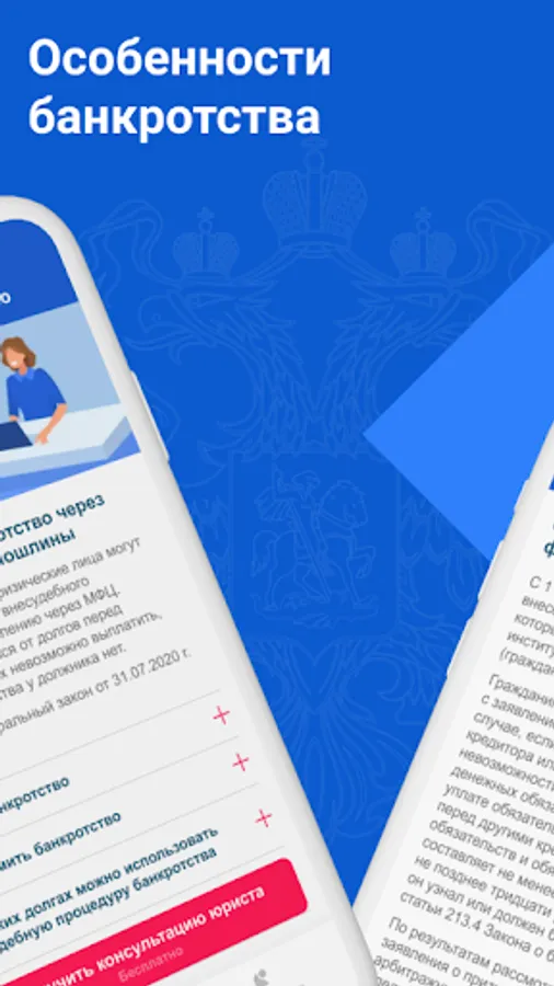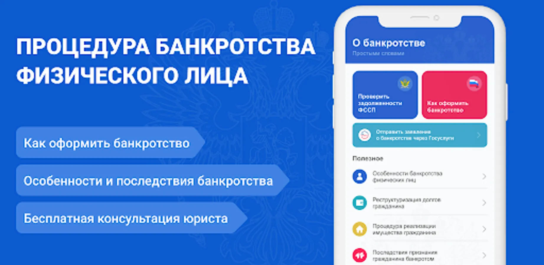 The Bankruptcy application contains up-to-date information on the bankruptcy procedure, helps to write off debts and get free legal advice online.