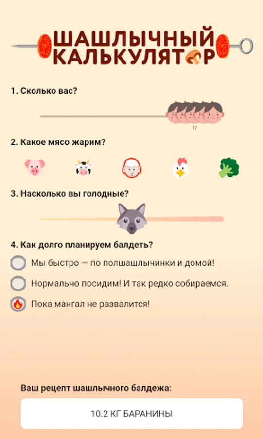 Next, the calculator will show you how many kilograms of meat you need for a clear evening!