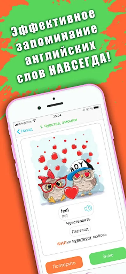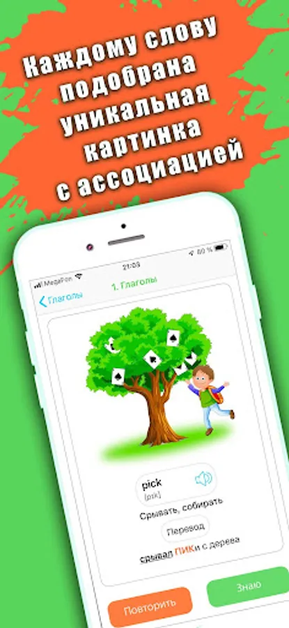 Everything is very simple! Each English word presented in the UWORDS app has a unique picture with an association that will forever bind these words to itself. And in the future, in order to remember a word - you just need to remember the picture associated with it.