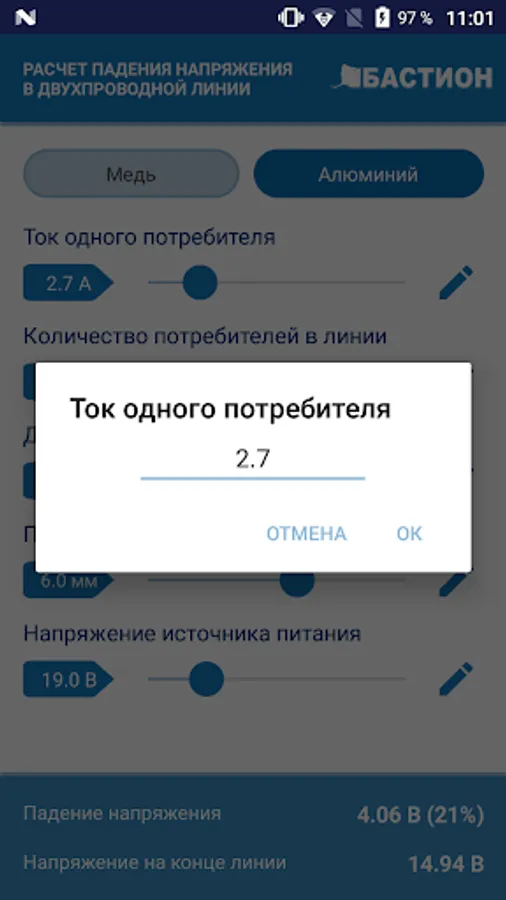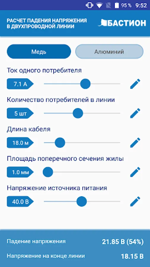 Allows you to calculate the voltage drop in a single-phase two-wire line of AC or DC, when using copper or aluminum cable.