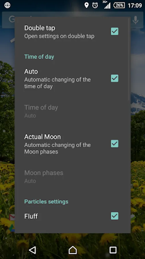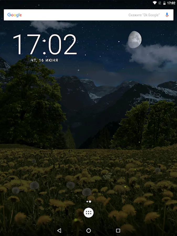 During the day the sun shines bright, clouds float in the sky and fluff flies in the air. At night the moon and the stars come out in the sky. Moon phases correspond to actual ones and change automatically! Stars are twinkle and fall, and fireflies whirl over the field.