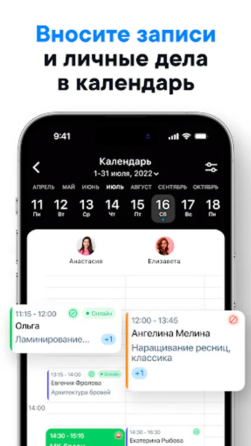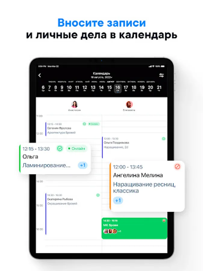 Convenient client registration, business analytics and reports are the reasons why manicurists, makeup artists, hairdressers, cosmetologists, eyebrow artists, masseurs love this application.