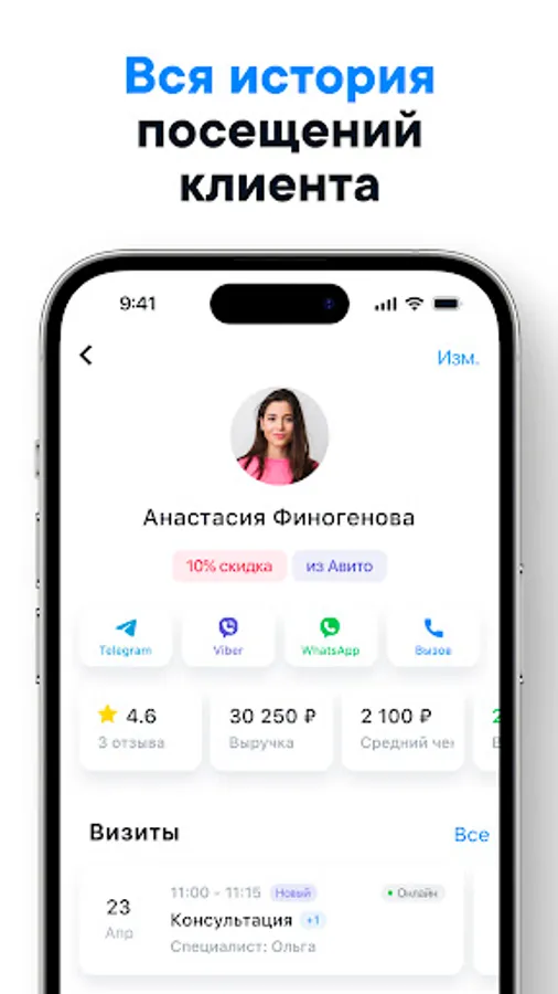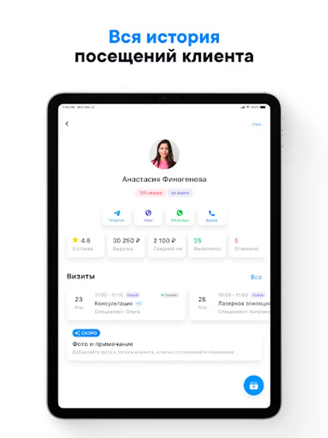 View upcoming and past entries, personal information about the client. Find clients near you. Find out what kind of revenue the client brings, his average bill.