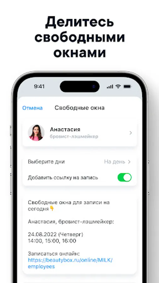Clients themselves sign up online via a link or through a client mobile application. At the same time, unlike many other services for booking services, our application provides online registration of clients for free. Convenient registration of customers is one of the most effective ways to increase their loyalty.