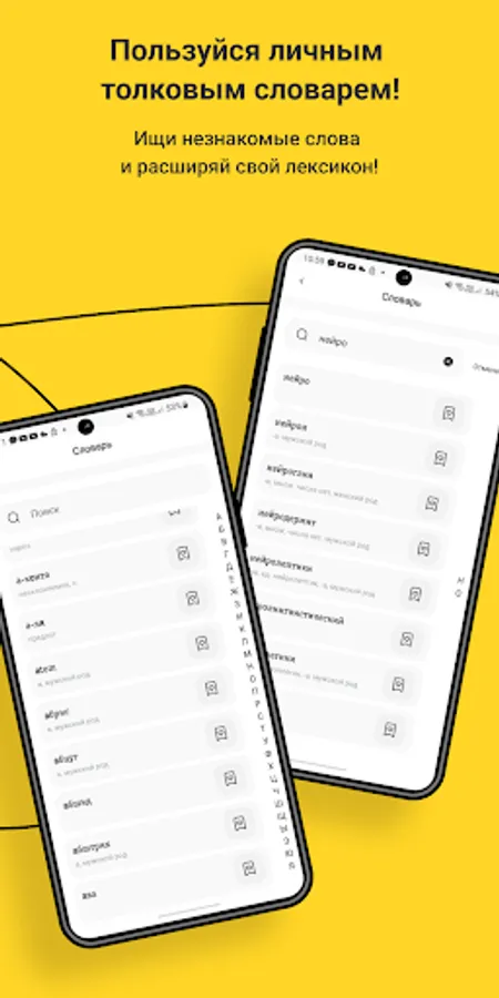 Use your personal explanatory dictionary! Look up the meaning of the word you are interested in in a dictionary of over 50,000 words. Add any word to your personal word list and the app will help you remember it by including it in your personal learning program.