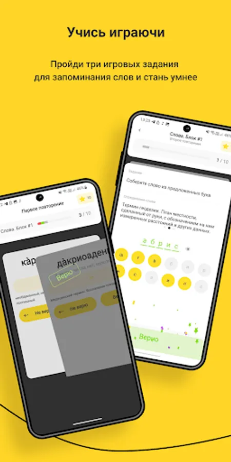"Babylon", "Puzzle" and "Believe / Don't Believe" are arcade games that will allow you to better remember the words you are learning, as well as replenish your vocabulary. For each word, an associative array is set to create a deep connection.