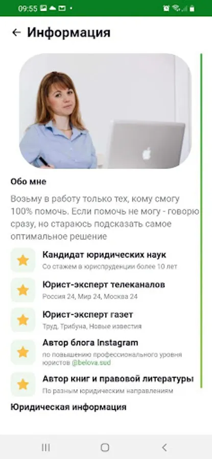 In this application, you can get advice on early retirement. Consultation is provided by Tatyana Belova, Candidate of Legal Sciences, with 10 years of experience in jurisprudence