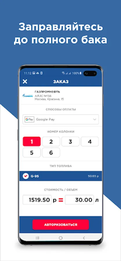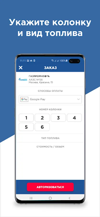 The user has the opportunity to select the required petrol station on the map or the application will determine it by geo-location automatically.