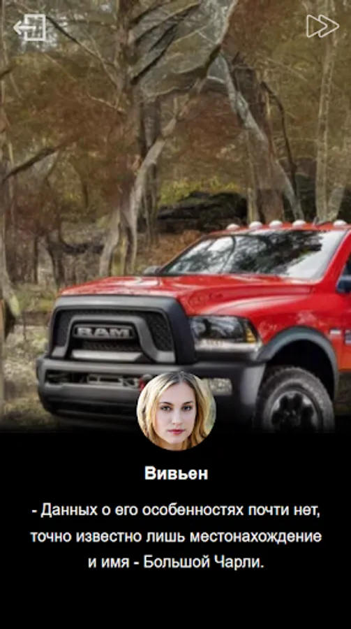 The plot of the novel leads us to the temple, where Vivien and Martin meet the pastor. A meeting of parishioners and a meal are planned here. Of course, our travelers are also invited. The main course is juicy meat… that same Big Charlie! They say that the taste of this steak/burger (underline as appropriate) is impossible to forget. But wait. An unexpected and intriguing question arises for the game: does this Charlie really exist?! The journalists will receive an answer to the question a little later in a very intelligible form ...