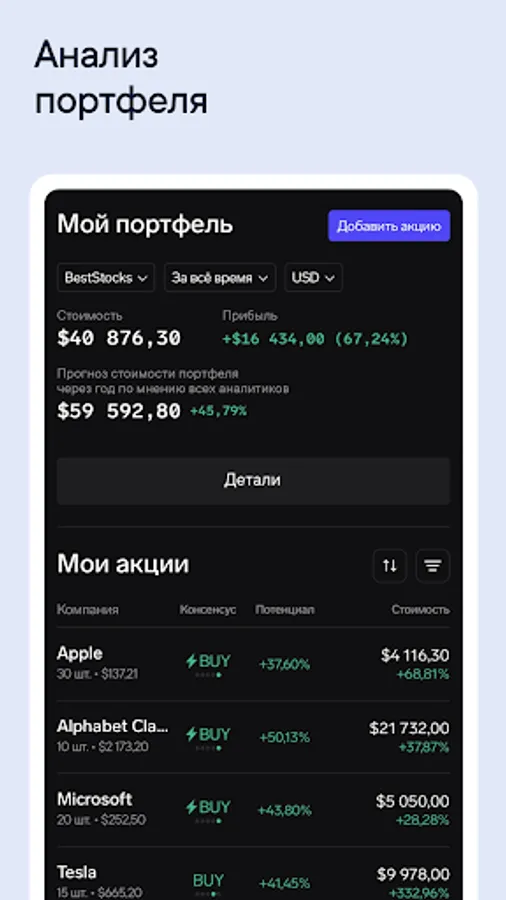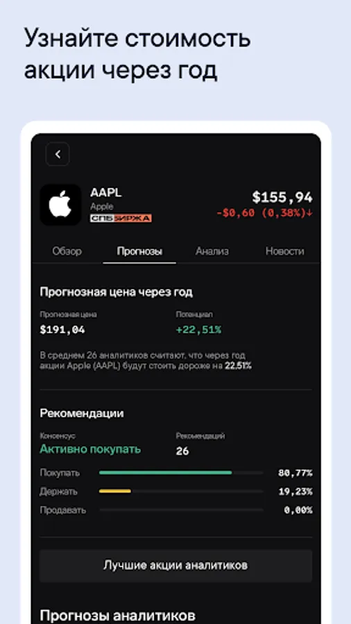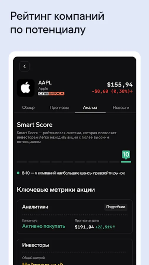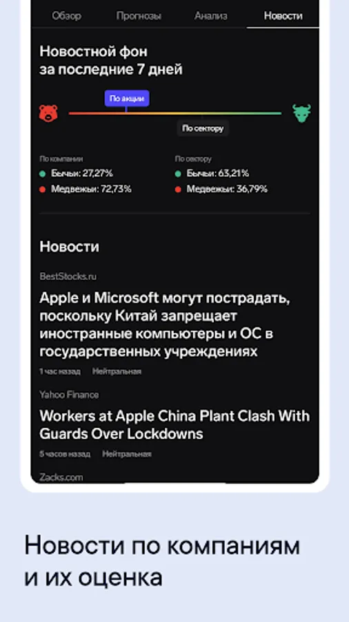 — detailed analytics for each stock (including consensus forecast, assessment of the investment attractiveness of the company, the mood of market participants, latest news)