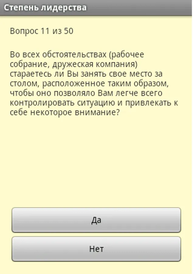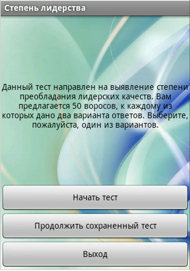 This test is designed to determine the degree of dominance of leadership qualities. Included in the unit tests of competence managers' Leadership in management. "Test consists of 50 questions with two different answers to each. In the program the opportunity to continue the interrupted test, the possibility of continuing a saved test through the menu, and the ability to start the test again. The app works offline. Without advertising.