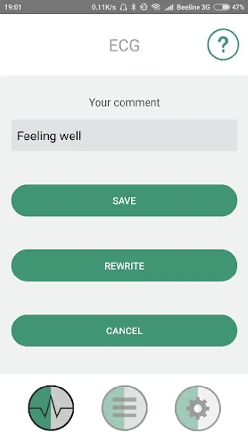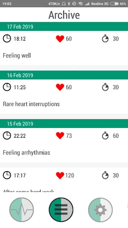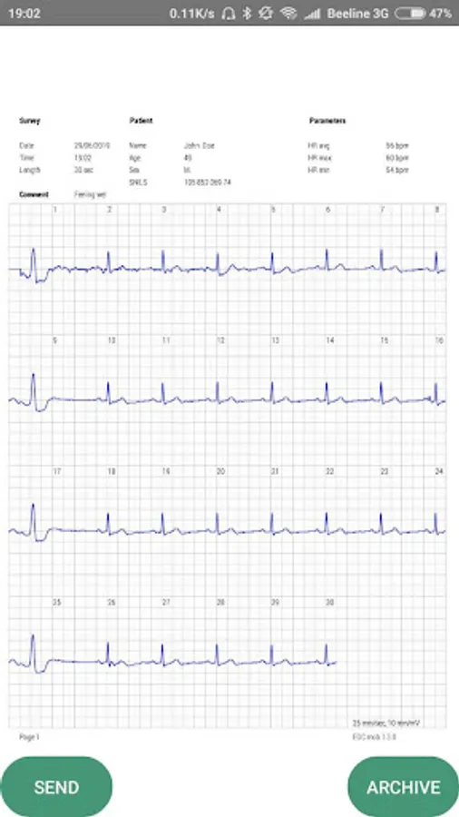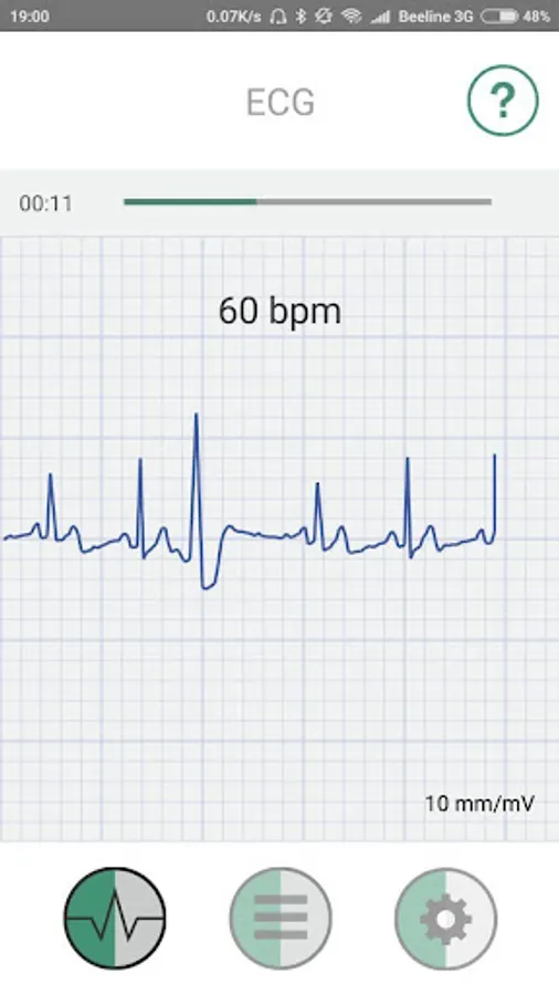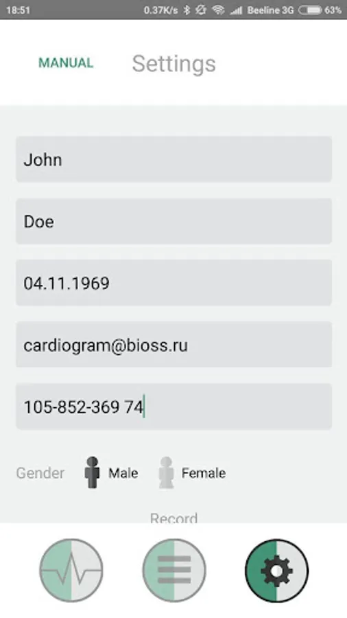 The application serves to work together with a mini cardiograph "Heart" or with devices close in parameters. "Heart" is produced by the company BIOSS and has its site cardio.bioss.ru, it shows all the data of the device and indicates where you can buy it. The system (device and application) is designed for recording, storing and transmitting an electrocardiogram (ECG), which is captured from fingers in everyday life at any time and anywhere and corresponds to the first standard arm-arm channel. The ECG signal is transmitted from the device to the smartphone through the headset jack (headphones). The ECG is displayed on the smartphone's display. This allows the patient to monitor the quality of electrode contact and monitor the start and end of the recording. The duration of the ECG record can be set based on the recommendation of a doctor (from 30 seconds to 3 minutes). After registration the ECG remains in the memory of the smartphone and, if necessary, is transferred to the doctor as a PDF file by mail.