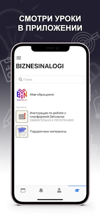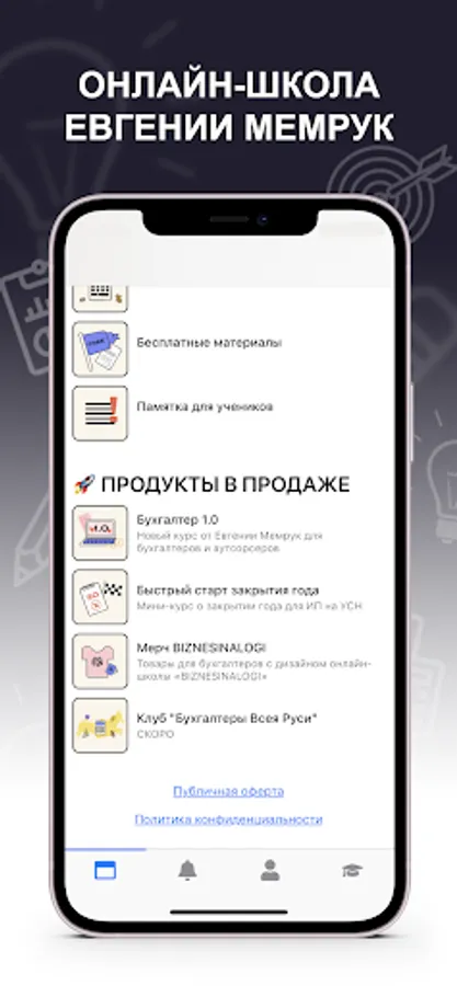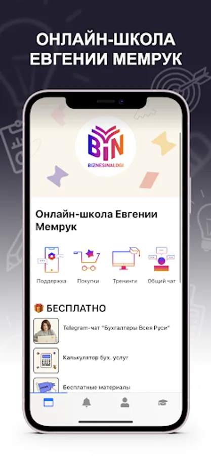 Evgeniya Memruk's @biznesinalogi learning platform in one application: Courses and trainings Webinar recordings Homework Mailing lists, notifications Chats with fellow students and curators Instructions and work with documents