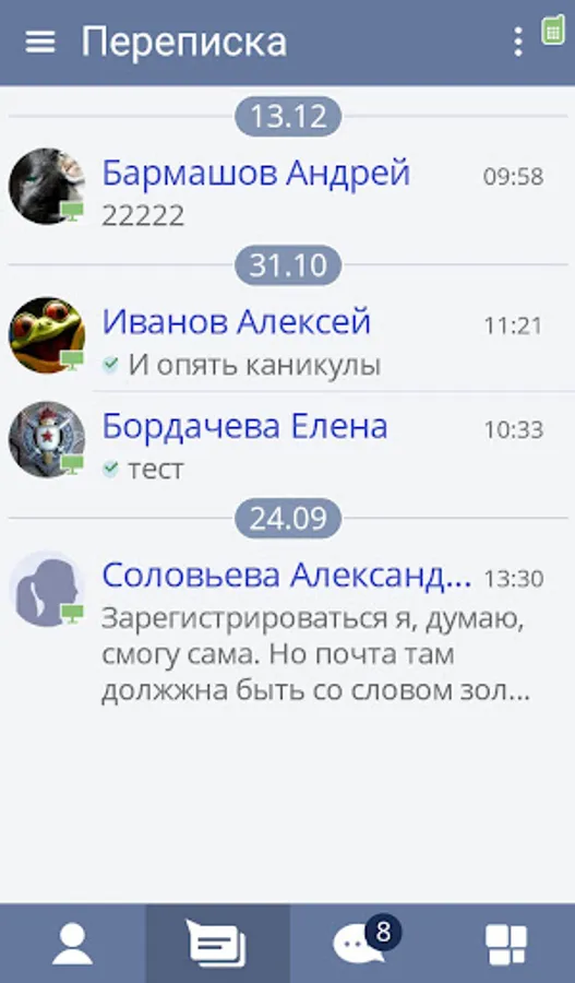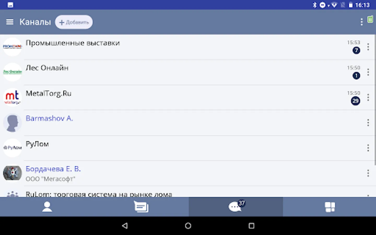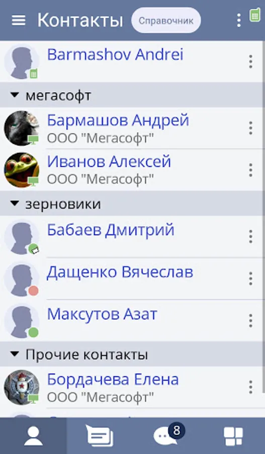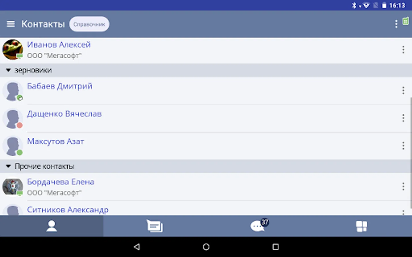 Open messenger. It is available for members of public communities and provides an opportunity for both personal and group communications (channels). A directory with information on participants is available: photo, phone, e-mail, whatsapp, viber, telegram, zoom, skype, vk, etc. with the ability to immediately contact these contacts. The participant's online status with device display: work or home computer, laptop, tablet or phone.