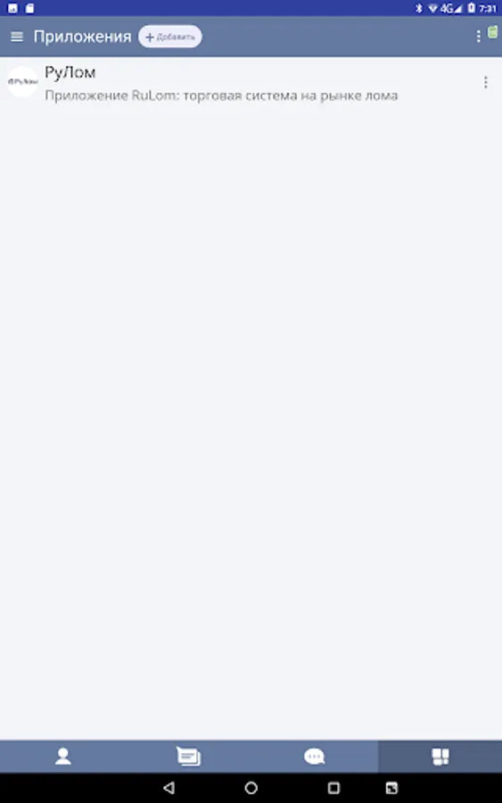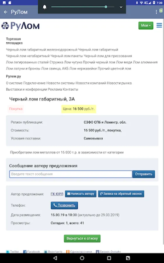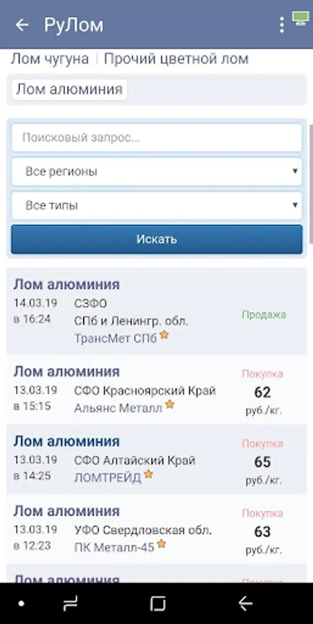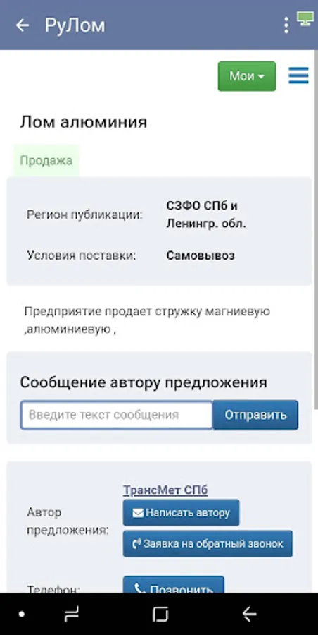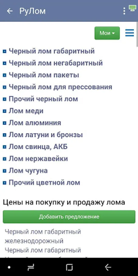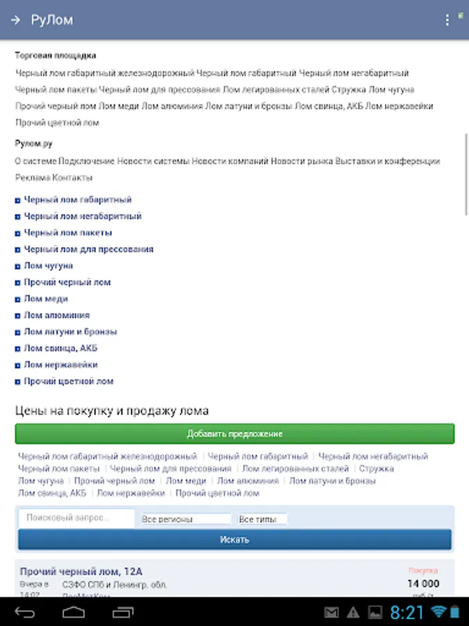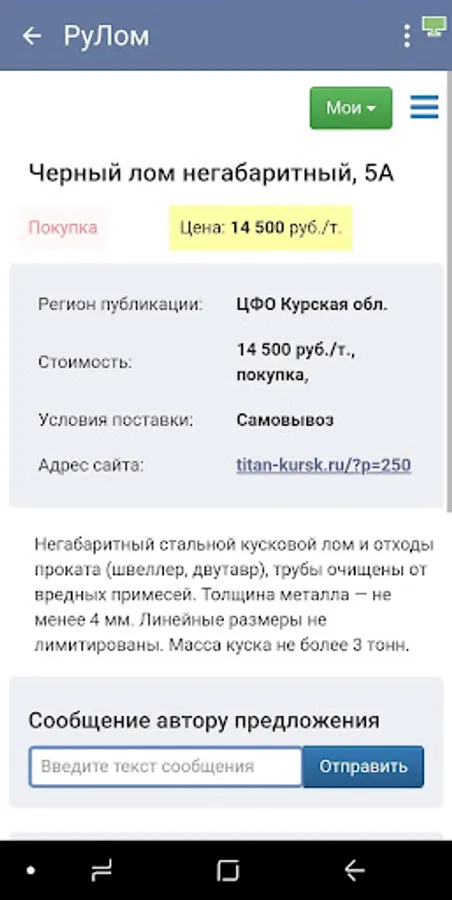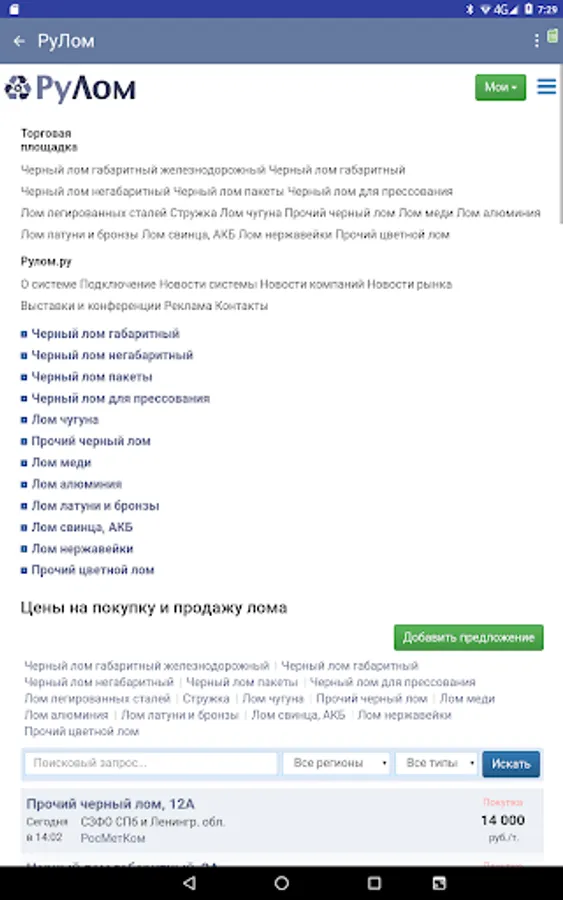 Mobile application trading platform RuLom.ru. Buying and selling bulk shipments of scrap metal, making proposals, agreeing on the terms of the transaction. The site presents the following scrap market segments: