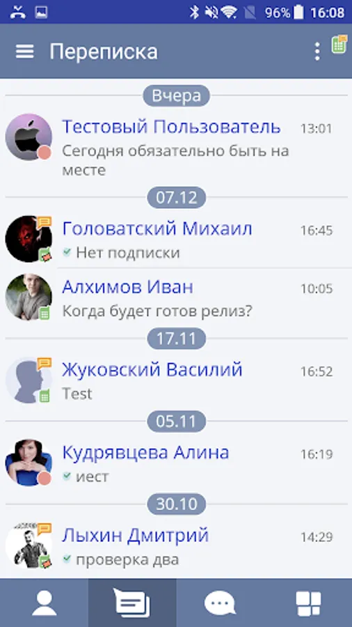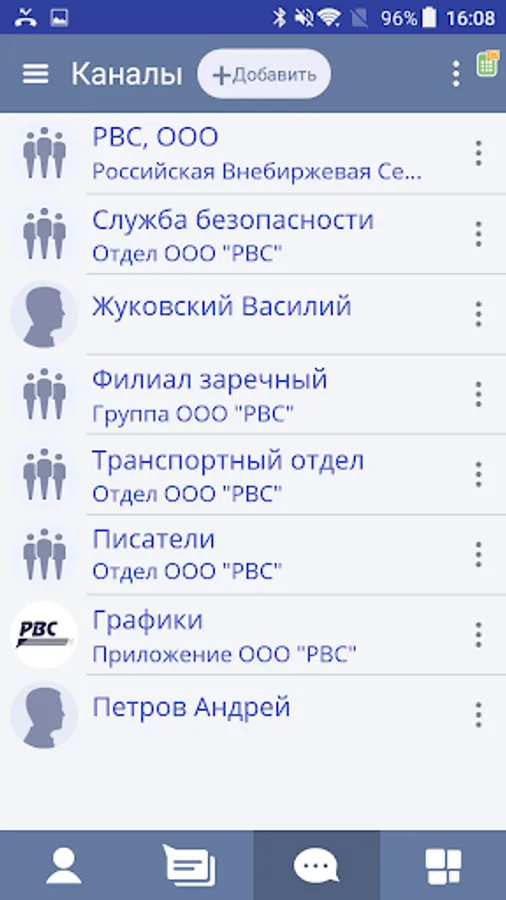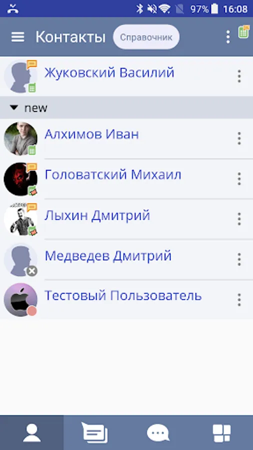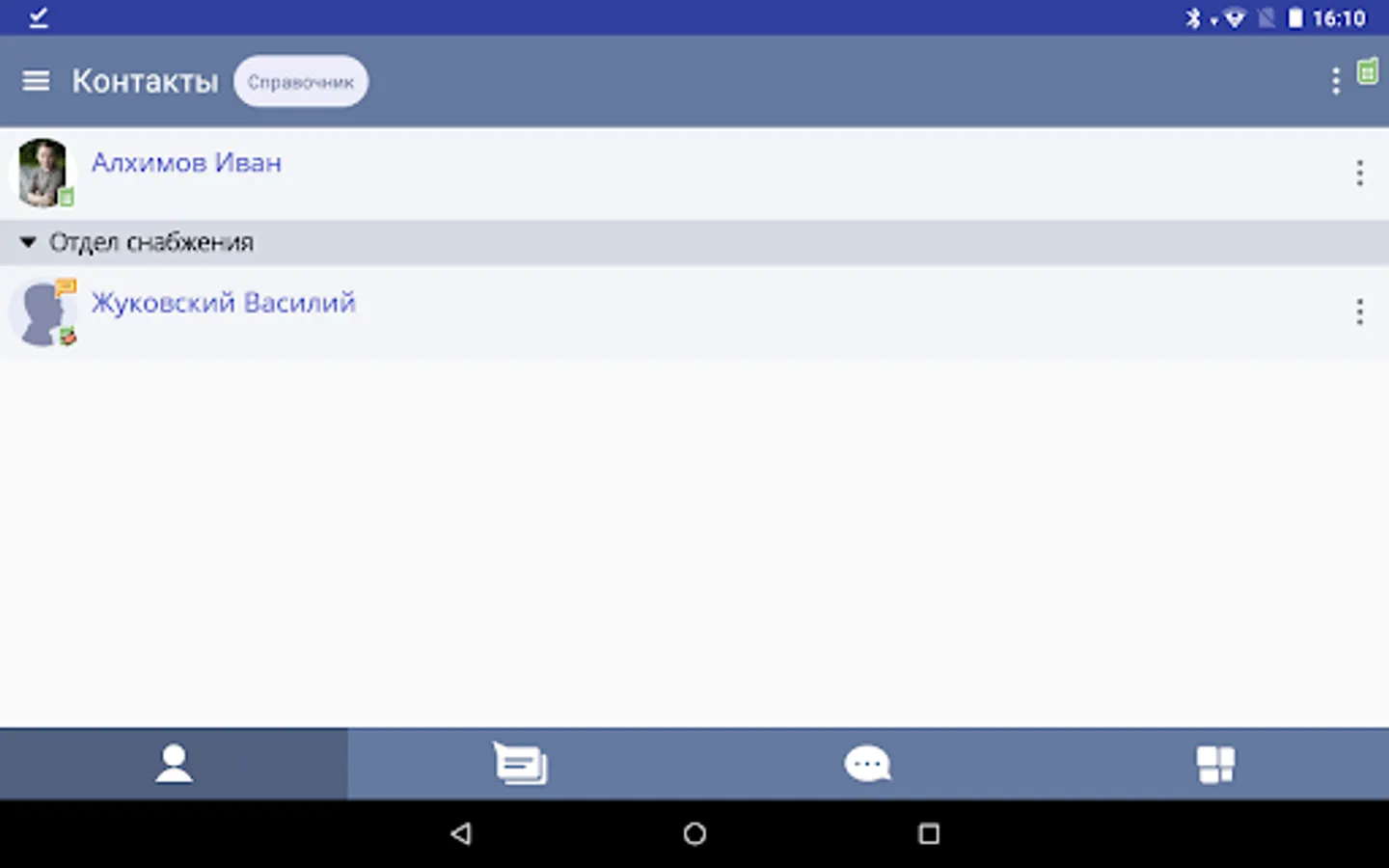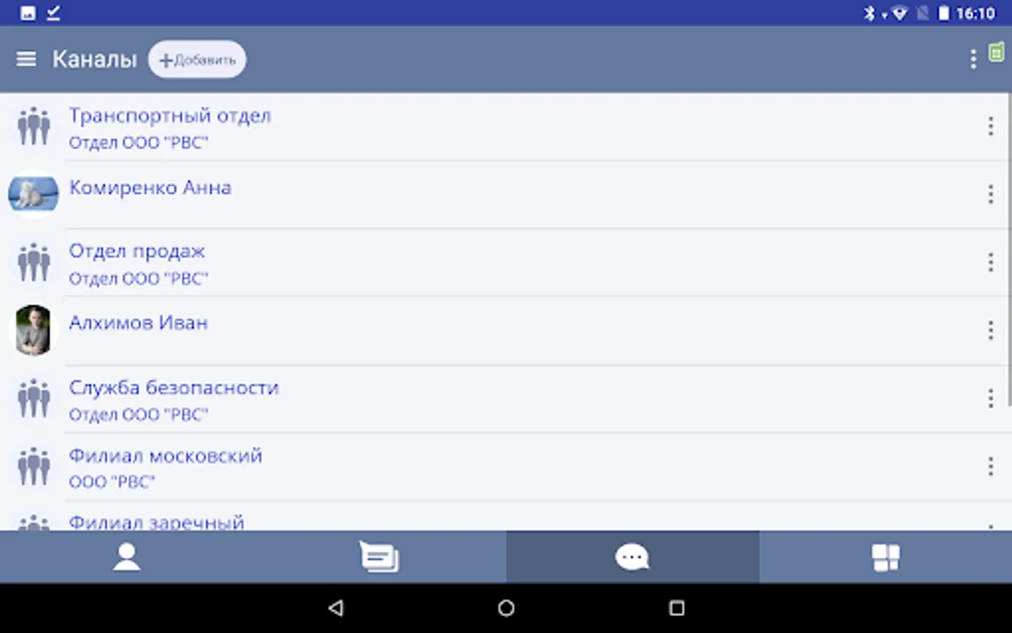 Closed intracorporate messenger. It is available only to employees of the organization and provides an opportunity for both personal and group communications (channels). A directory with information on employees is available: photo, affiliation to departments, phone, e-mail, whatsapp, viber, telegram, zoom, skype, vk, etc. with the ability to immediately contact these contacts. An employee's online status with device display: work or home computer, laptop, tablet or phone, which is especially important for full-fledged collaboration with remote employees.