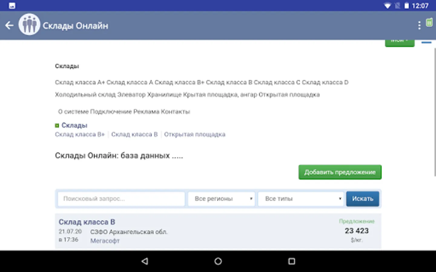 The warehouse services marketplace Warehouses Online (sklady-online.ru) offers a mobile application for quickly placing your offers and searching for services in the following sections: