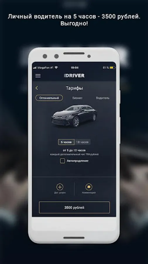 The application allows you to order a car with a personal driver for 5 or more hours or a professional driver to control your car.
