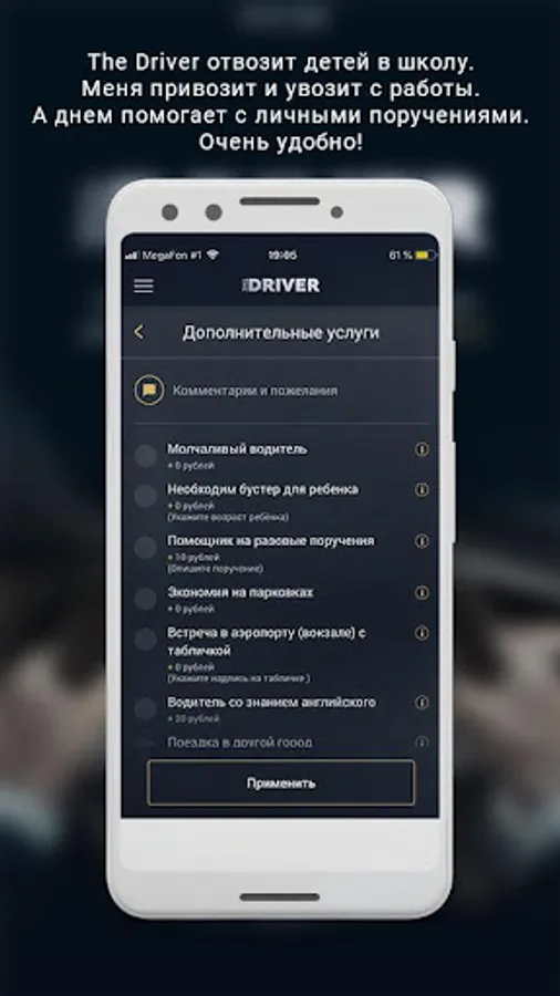 The Driver provides a personal driver service: it is not only a high-quality car, but also personal service and attention to each client.