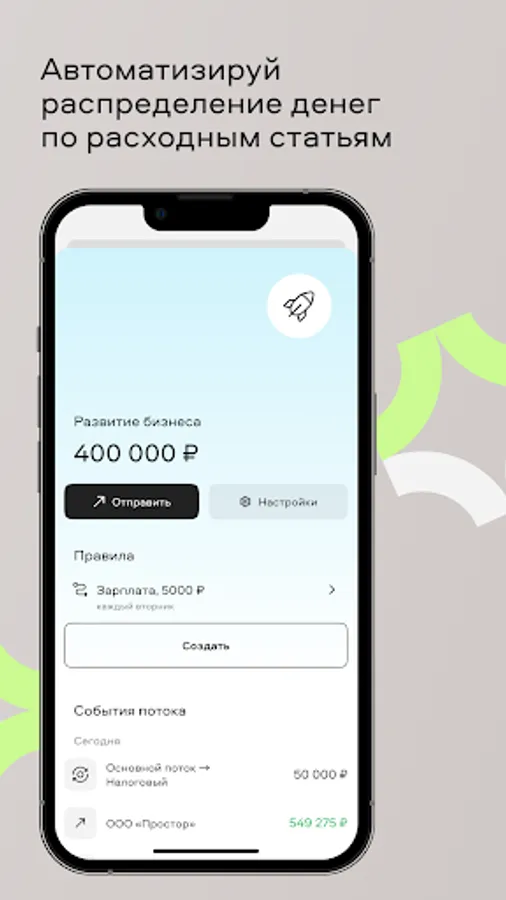 We don't have invoices, and you won't have boring spreadsheets in Excel anymore. Instead of a general pile of money, your finances will now be systematized in separate flows that you will set up yourself. For example, 6% of receipts for the "Tax" stream once a month or 50,000 rubles every month for vacation. The money will be distributed automatically, and you will always have a ready amount.