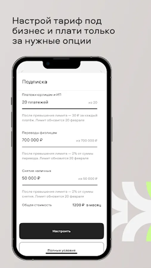 Tariffs are a thing of the past. We have selected the most necessary options for business, which you can enable and disable for free and whenever you want. For example, this month you need 20 payments, and the next one only 5 - so you will not overpay for unnecessary options.