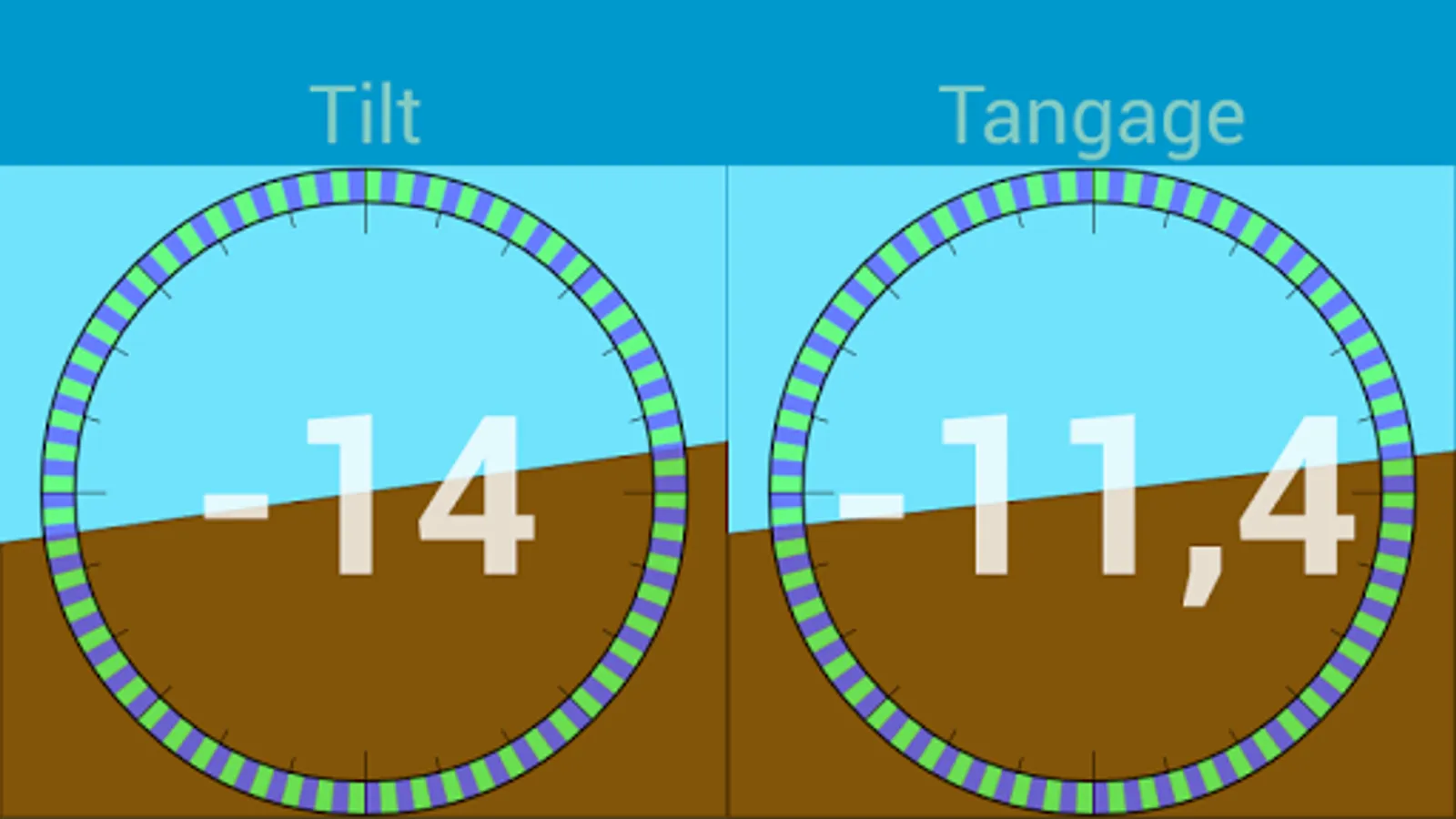 After calibration, you can observe the grades of tilt and tangage (roll and pitch) on the main screen of the application. Grades are displayed in % (100 * tan (α)) .