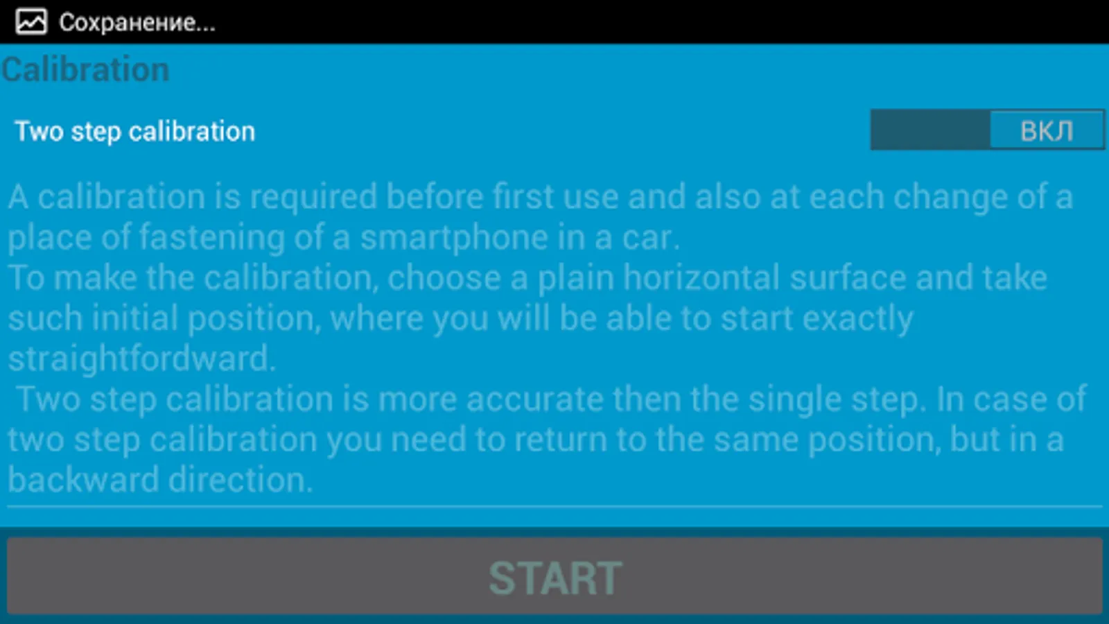 The calibration process is very simple. First, fix the smartphone in a convenient place.Then it is necessary to place the car on a flat horizontal surface. After that the application will measure the gravity vector, and then you must confidently move in the forward direction before reaching the pedestrian's speed.