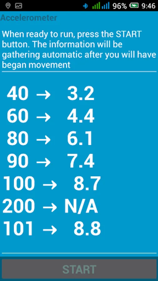 Starting with version 2.01, it is possible to measure acceleration times for several preset speeds (40, 60, 80, 90, 100, 200 km/h and the maximum speed achieved). To measure the acceleration, use the main application menu.