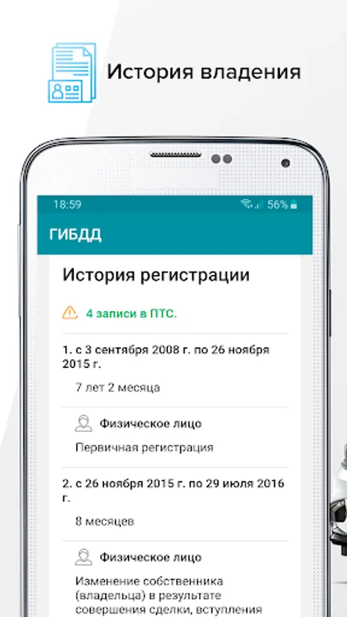 Obtaining basic information about the vehicle and the periods of its registration with the traffic police and public services for various owners. Obtaining data on vehicle scrappage. Car history check.