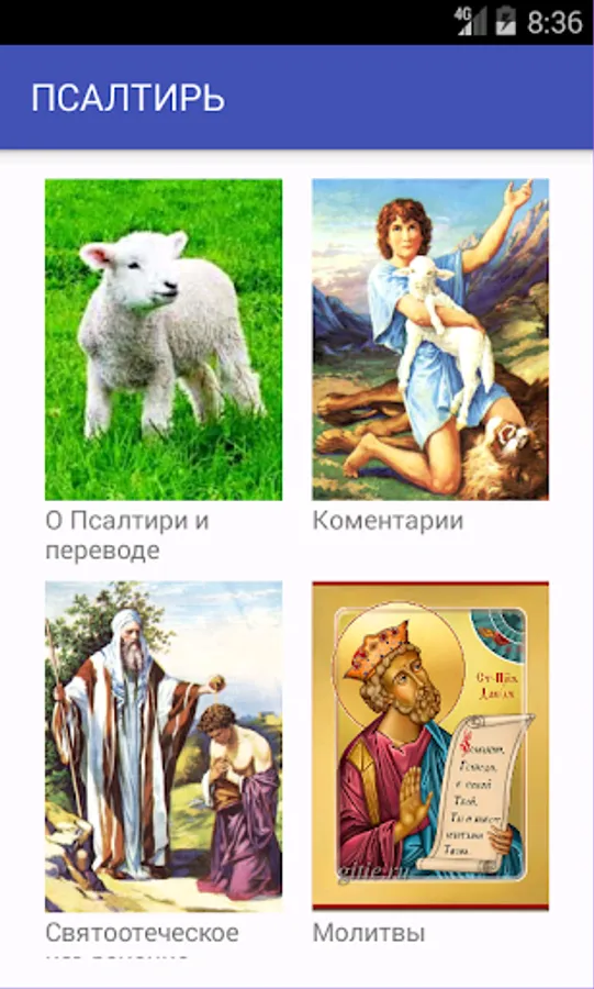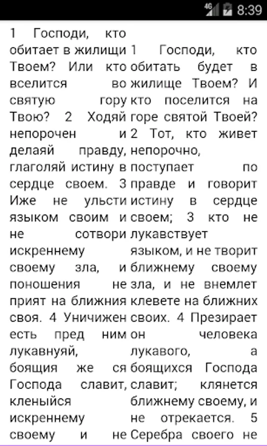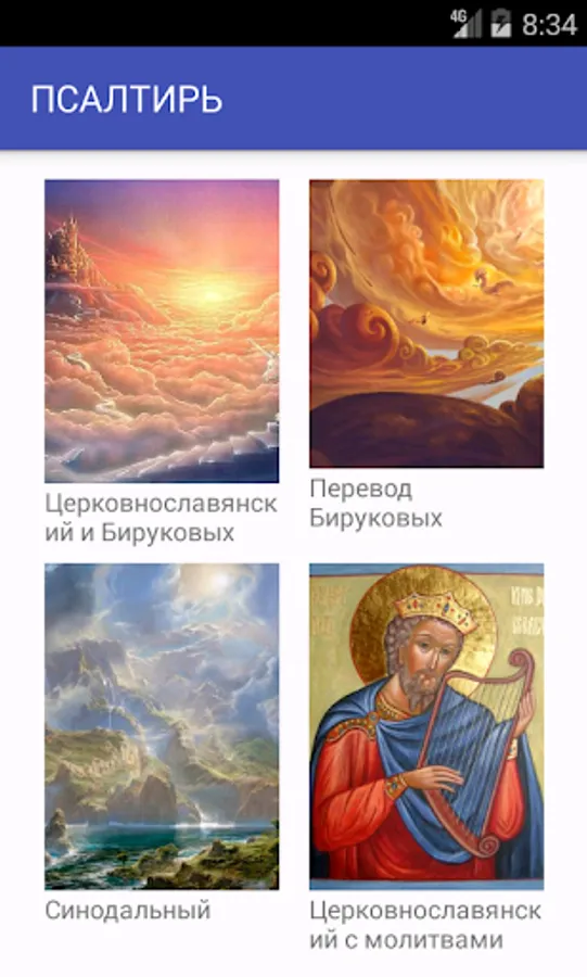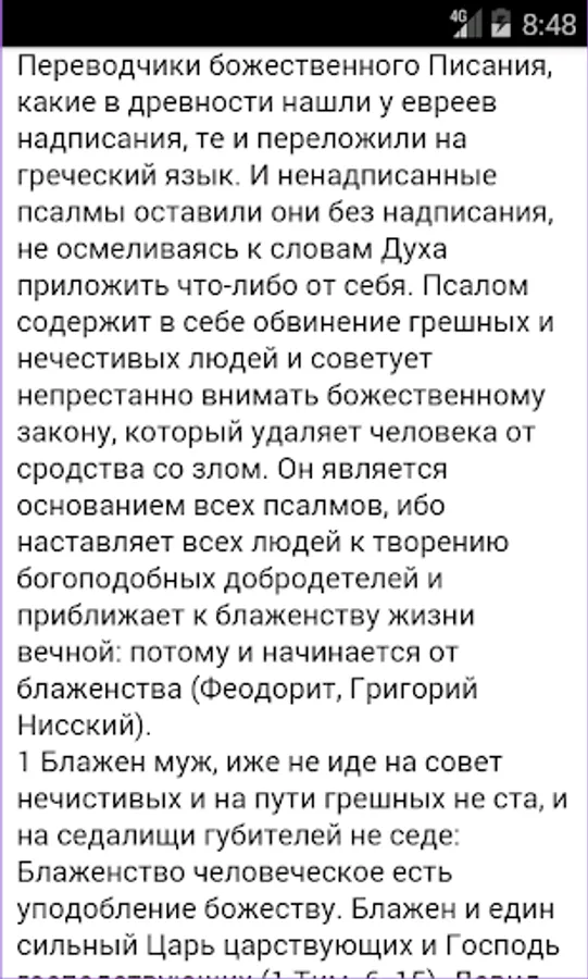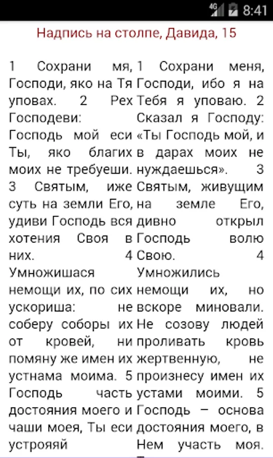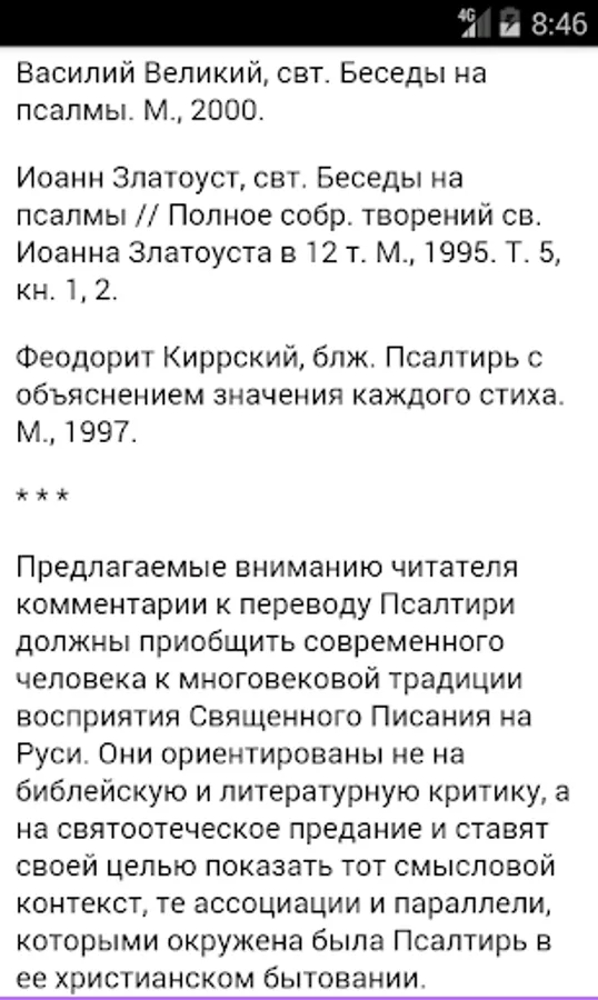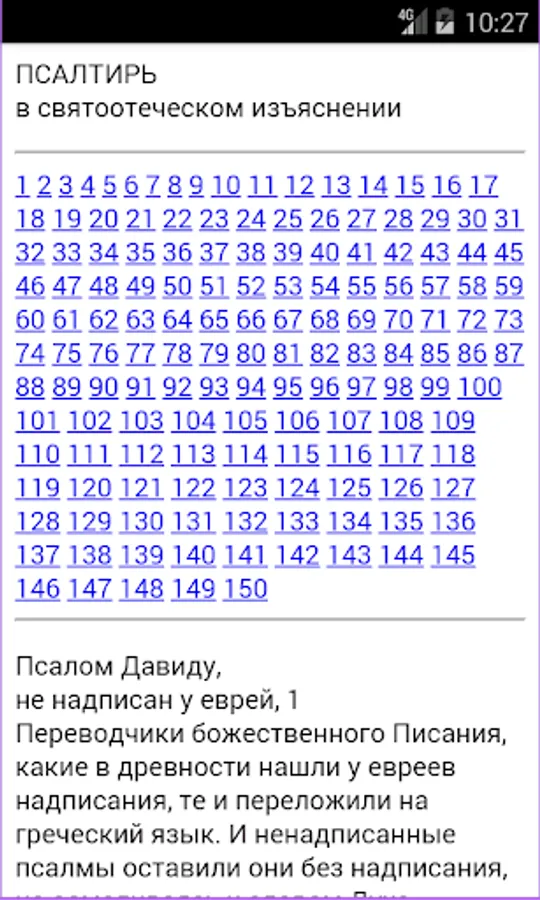 The Psalms of King David, are offered in four versions read. Parallel reading of Church Slavonic translation (Russian spelling) and he loved the translation Birukovyh (contributes to easy learning Church Slavonic language). Separately Birukovyh translation. Synodal translation. And the Church Slavonic (Russian spelling) with prayers. In addition, prayers are offered as a separate book. More article on the Psalms and translation. And T.A.Miller Comments on the Psalms. Book patristic explanations.