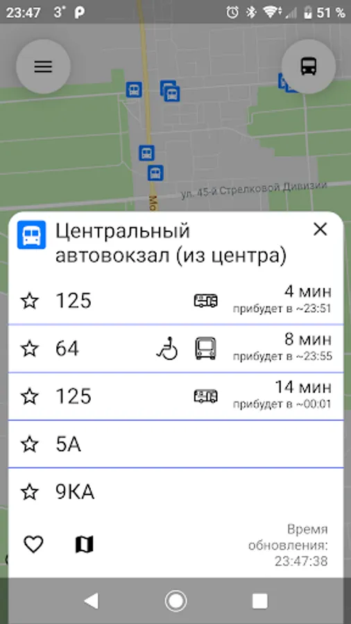 The application displays only urban routes. If it becomes possible to obtain data on suburban routes (including in New Usman), then this opportunity will be added.