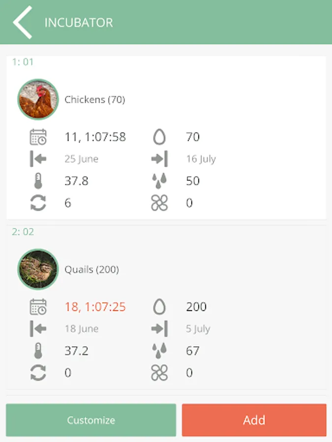 Our poultry feed app is designed to facilitate the collection of information and keeping statistics of your poultry farm. After all, literate analysis and keeping the history of your bird's development are the guarantee of a healthy and reproductive livestock of the poultry farm. In the section "incubator" you can easily track the incubation of eggs, the date of the bookmark, temperature and humidity.