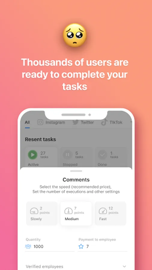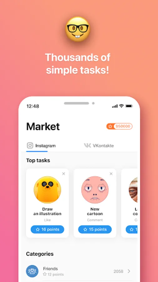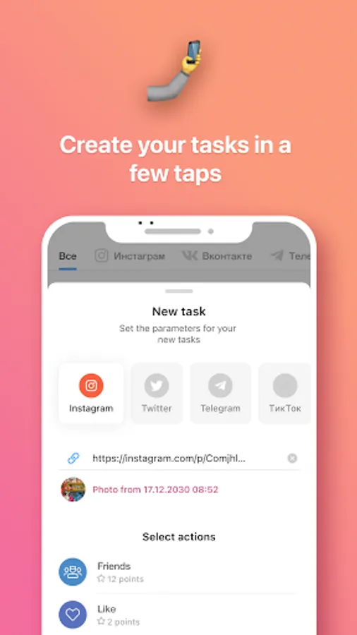 Create your own tasks, meet new friends, get likes, followers and other activity in Instagram, Twitter, TikTok, Telegram, Vk, Ok.