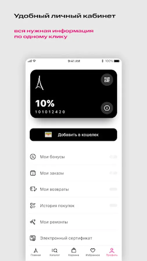 All information about your purchases, the status of the bonus account, adding products to favorites, the ability to track price changes for selected models and alerts about new arrivals and profitable promotions.