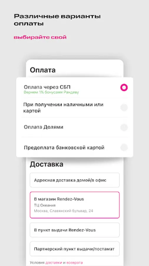 You can pay for the purchase in a convenient way: in cash upon receipt, by bank card, through the fast payment system (FPS) or using the Shares service.