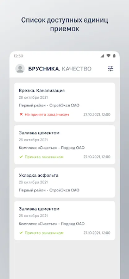 The application is integrated with 1C and BIM Cost, automatically generates an interim acceptance certificate and sends all the necessary information to 1C and BIM.