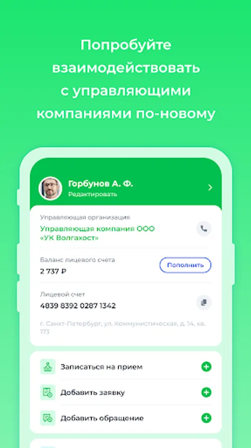 Using the application, you can easily and quickly interact with the management company of your house VolgaHost LLC TIN 3443143660: