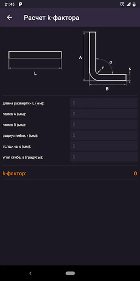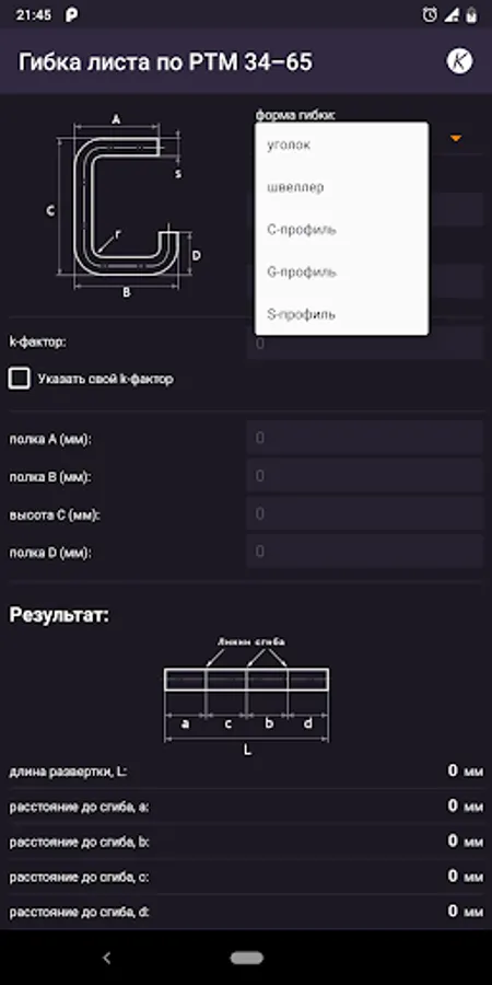 Calculation of the sweep for bending sheet metal according to RTM 34-65. Calculation for profiles with a bending angle of 90 degrees: Corner, channel, C-profile, G-profile, S-profile. The program also allows you to calculate, according to the results of measurements, the value of the K-factor.