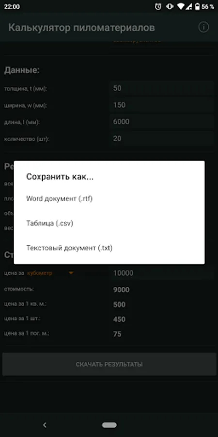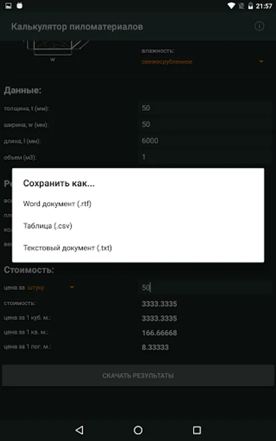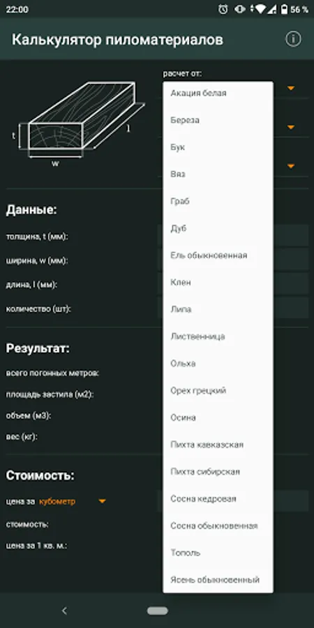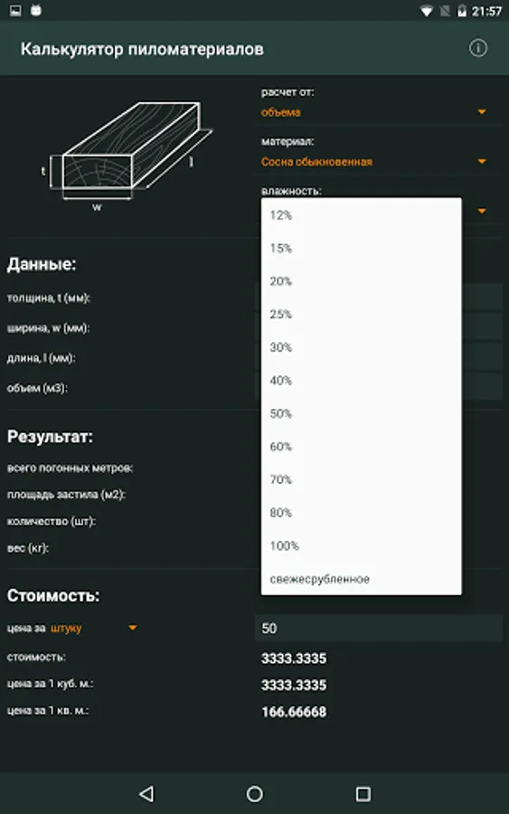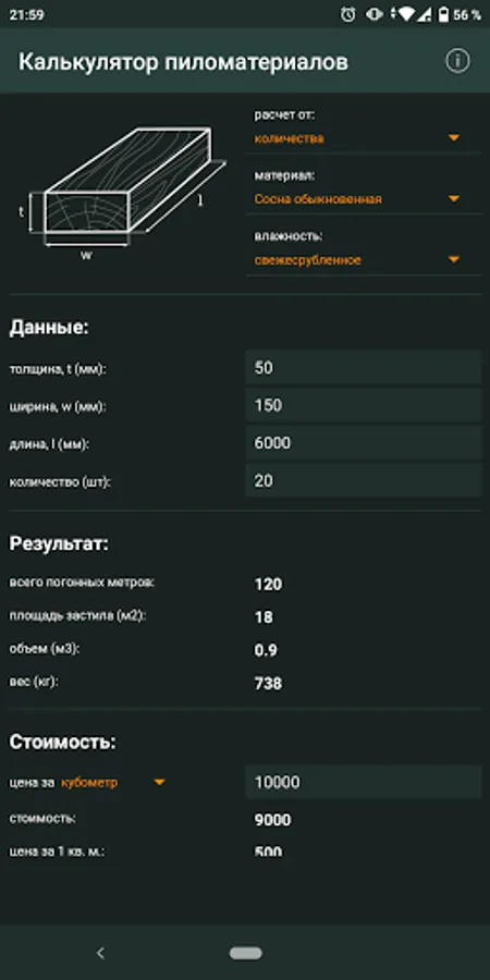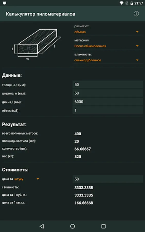 The Lumber Calculator is an easy and convenient application for an approximate calculation of the volume, area, weight and number of boards or timber.