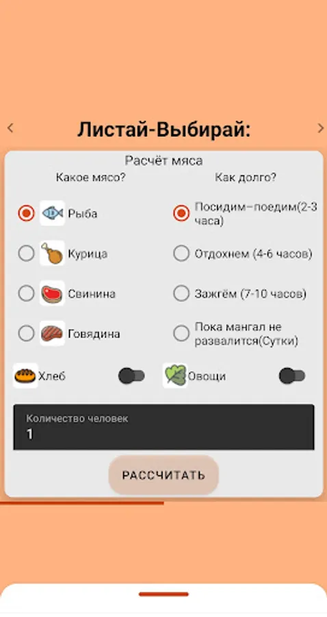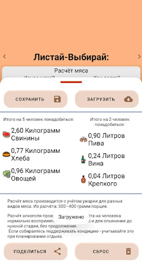 Our calculator will be able to guide you on the amount of meat and alcohol for planning outdoor recreation.