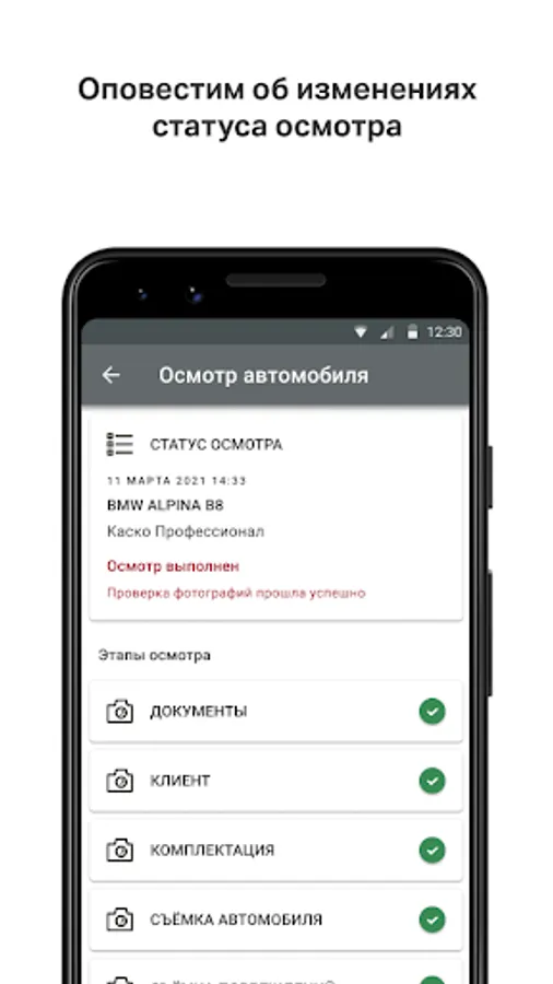 With this application, you can inspect cars using step-by-step tips. All photographs taken and entered data are automatically transferred to the Insurance Company for consideration. This convenient service significantly speeds up and simplifies the process of insurance, as well as consideration of the Client's application.