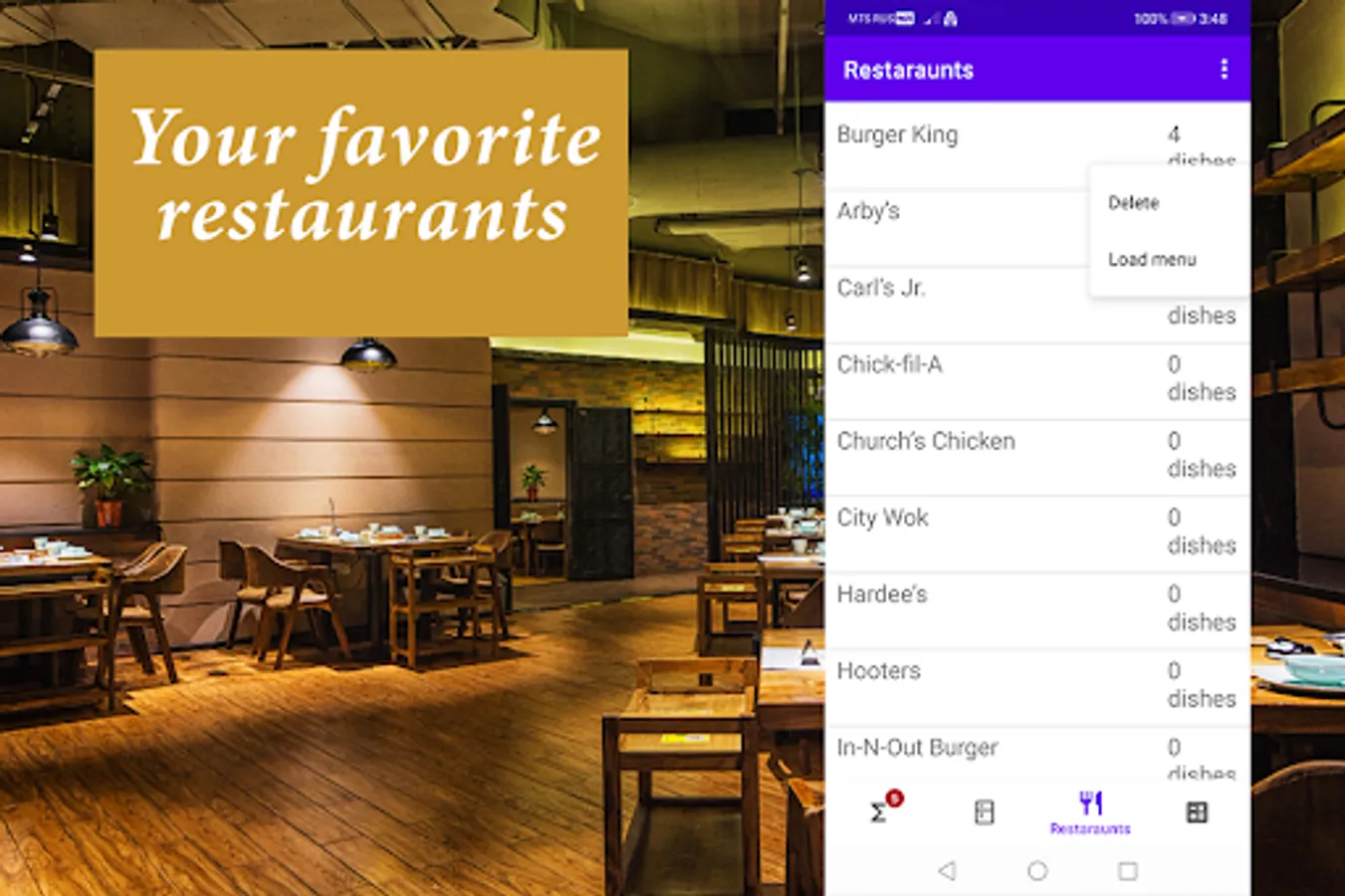 Another alternative option for filling out the list for calculating the cost is to go to the Restaurants tab and by long-clicking on the selected restaurant select 👉Load menu.