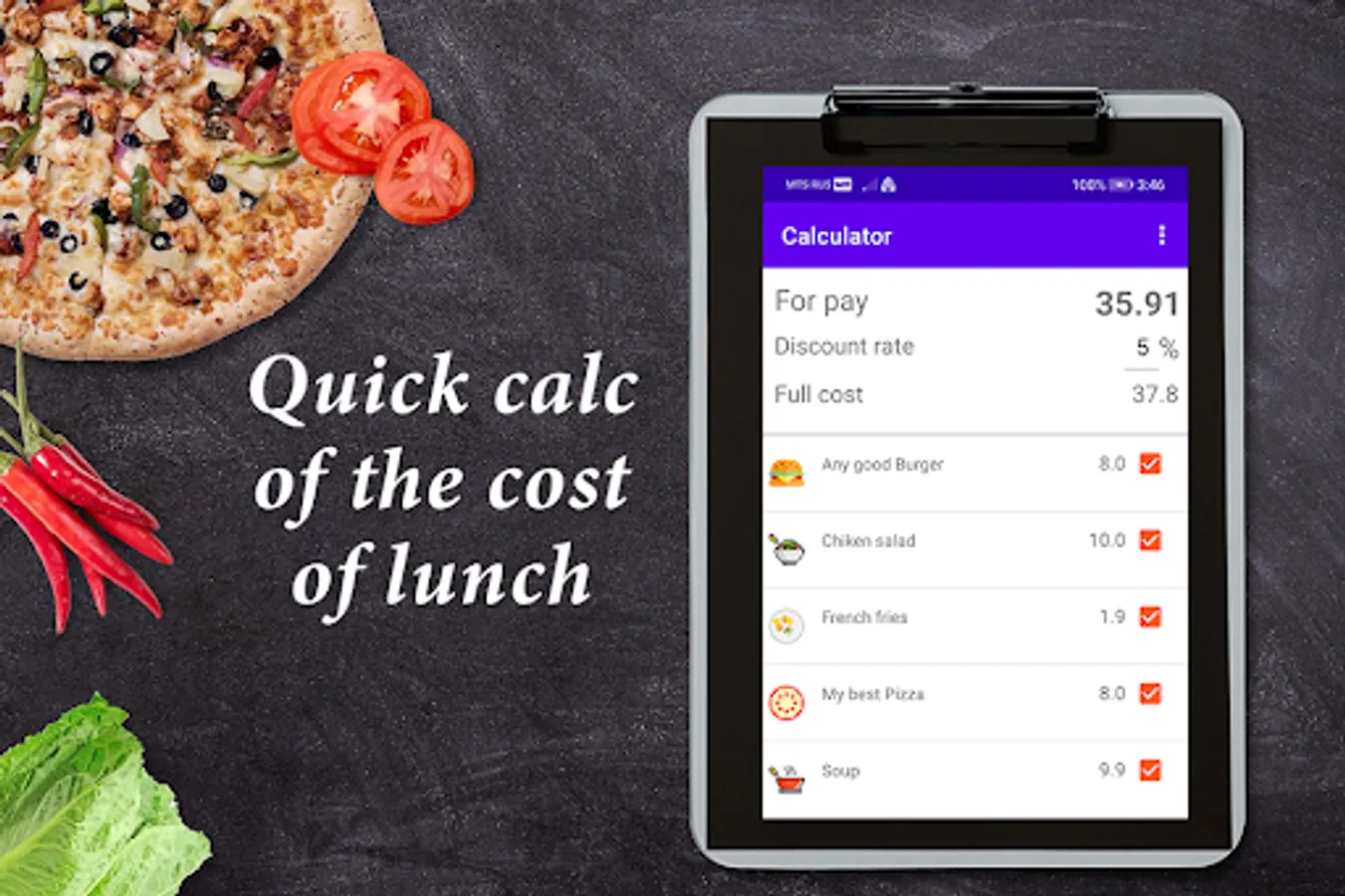 The menu calculator will allow you to quickly check the restaurant bill against a pre-entered list of dishes(food)