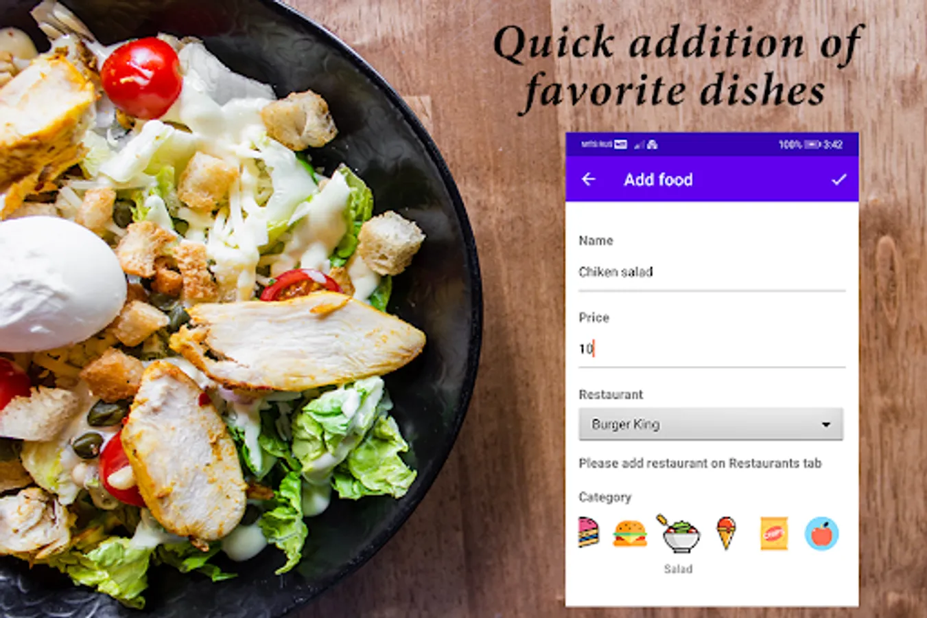 Add all the dishes you would normally order for each of your restaurants. Specify the price of each dish and select a restaurant when adding.